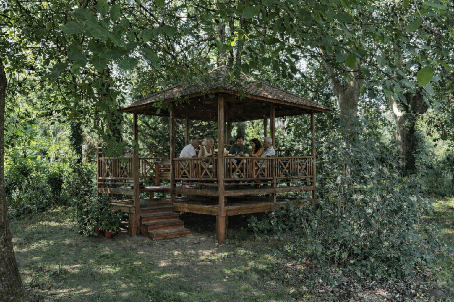 Au cœur de ce parc enchanteur, un gazebo sur pilotis vous offre un espace de convivialité avec vue sur la rivière, parfait pour déguster une coupe de champagne entre amis ou en famille